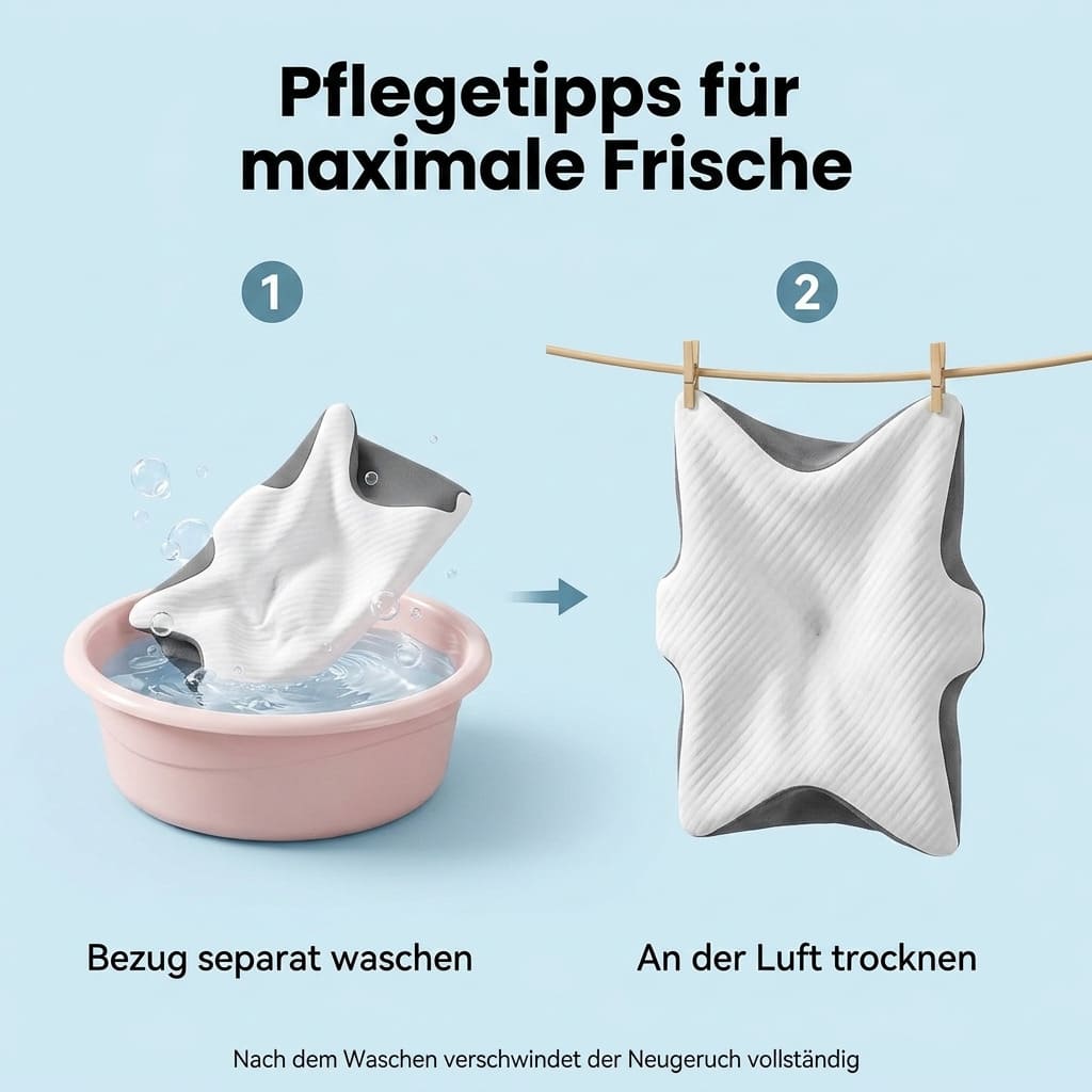 ⚠️ Wichtiger Hinweis: Bitte wasche nur den Bezug. Der Memory-Foam-Kern des Kissens darf nicht gewaschen werden, da Wasser die Zellstruktur des Schaums zerstören würde. Ein regelmäßiges Lüften des Kerns reicht völlig aus.